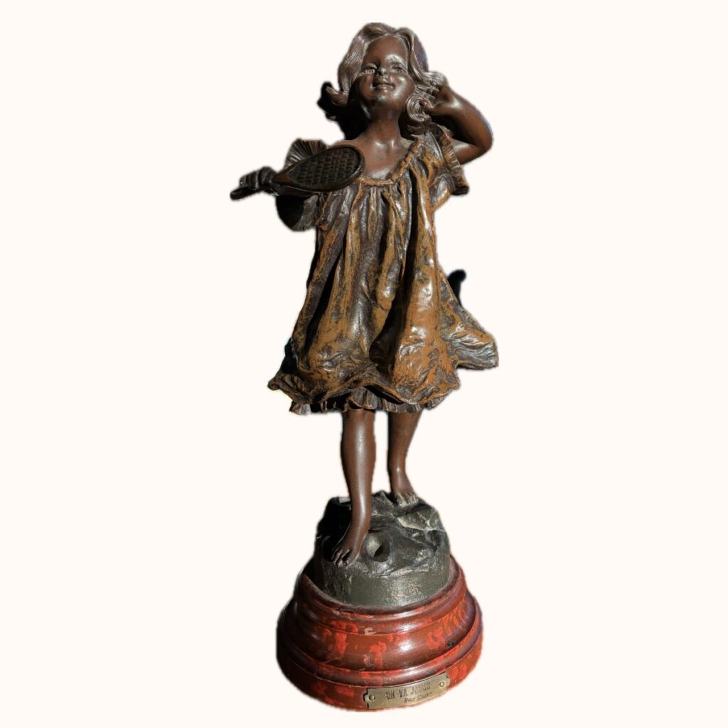 Sculpture en régule signée Dubois sous le pied gauche représentant une jeune fille jouant à la raquette, sur un support en bois. Une étiquette « ON VA JOUER Par Flora » est apposée sur le socle.