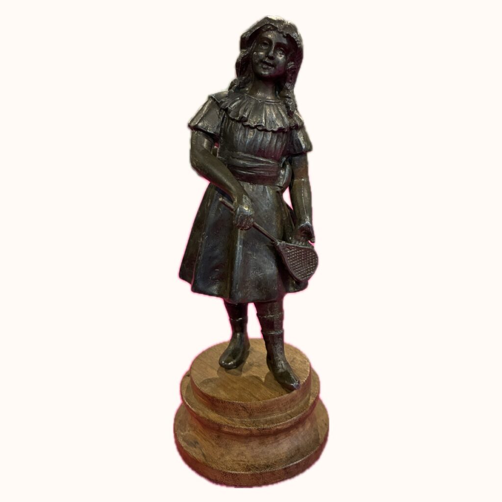 Petite statue en régule représentant une jeune fille tenant une raquette certainement à volant, sur un support en bois.